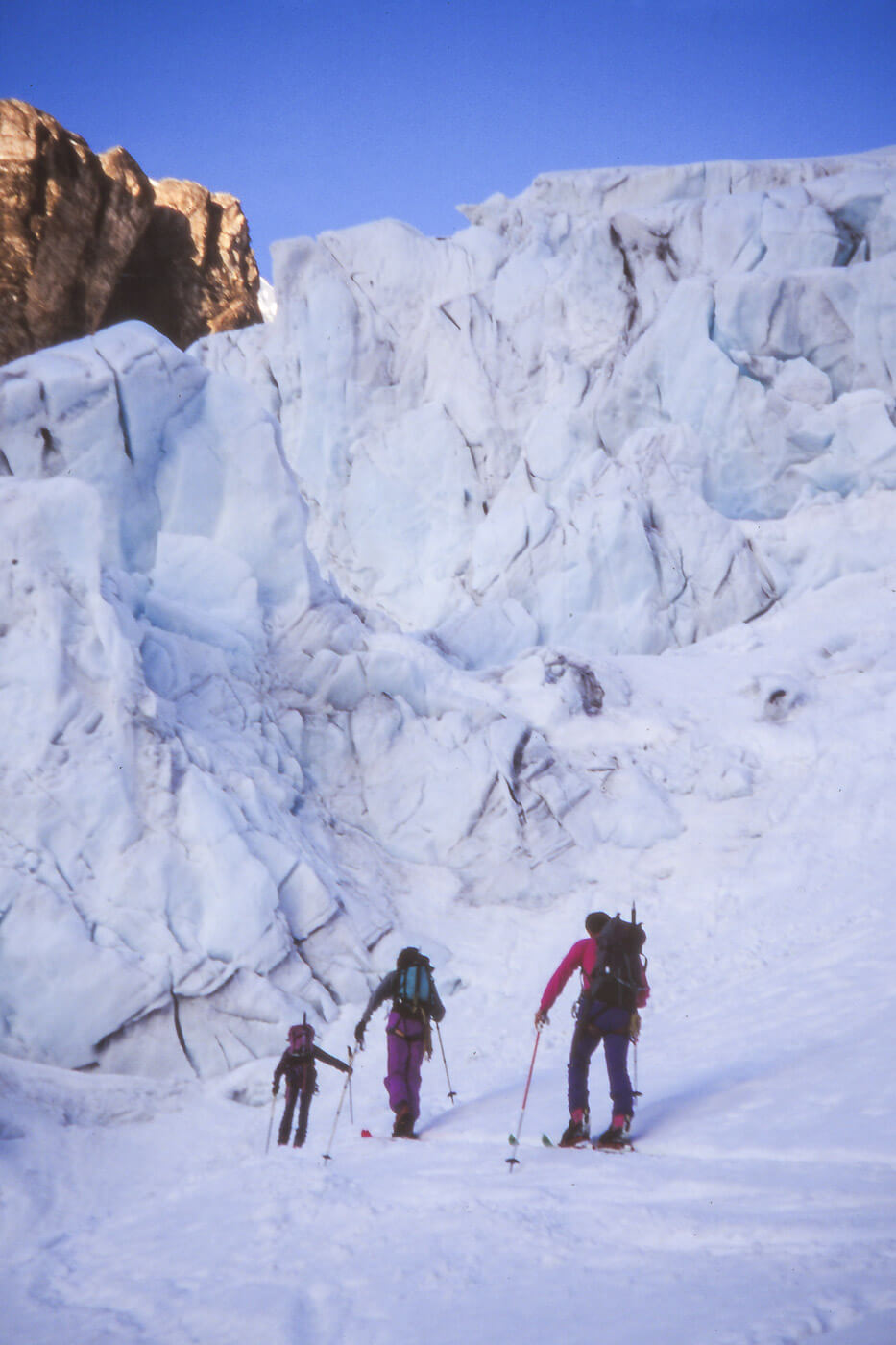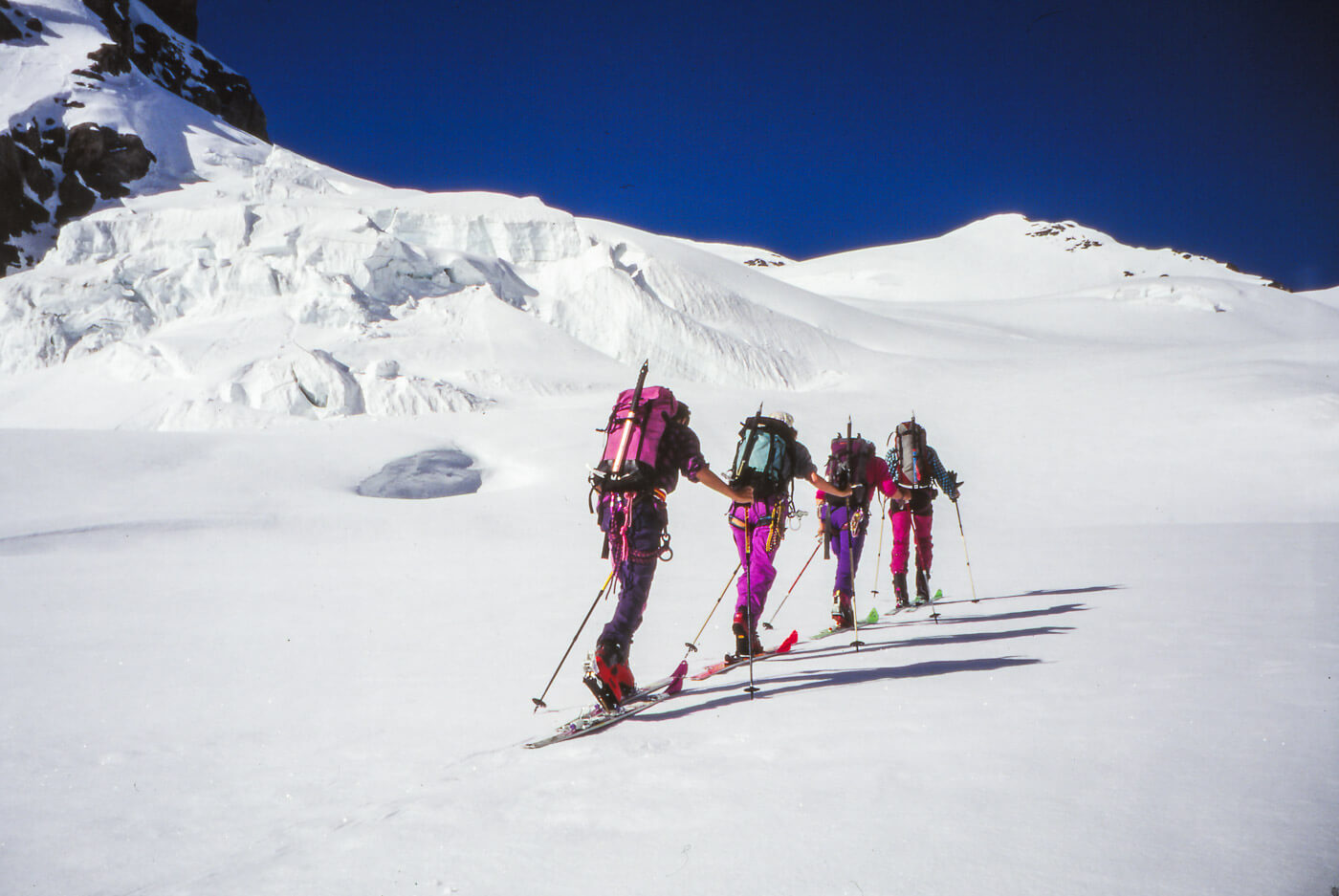 Den Tödi besteigt man meist von der Fridolinshütte aus, sowohl im Winter wie im Sommer. Wir haben dies 1995 gemacht, man beachte die Farben der Kleider!