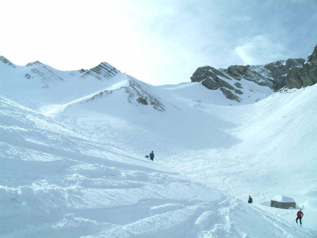 Runter dann in (zumindest in unserem Fall) besten Pulverschnee über die Nordflanke Richtung Wägitalersee. Wir fahren jedoch nicht ganz bis zum See, sondern erreichen mit kurzem Gegenaufstieg die Fläschlihöchi und fahren von hier zurück nach Studen.