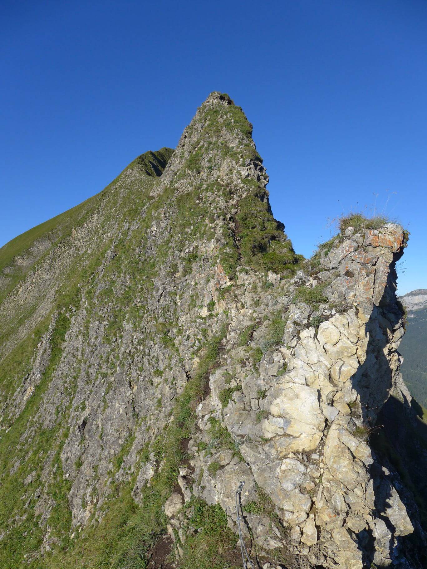 Das markante Tannhorn ist von weit herum sichtbar und wird meist als Schlüsselstelle der Tour bezeichnet. In der Tat geht’s da links und recht ordentlich runter und Trittsicherheit sowie Schwindelfreiheit sind hier zwingend. Doch das gilt sowieso für die ganze Tour.
