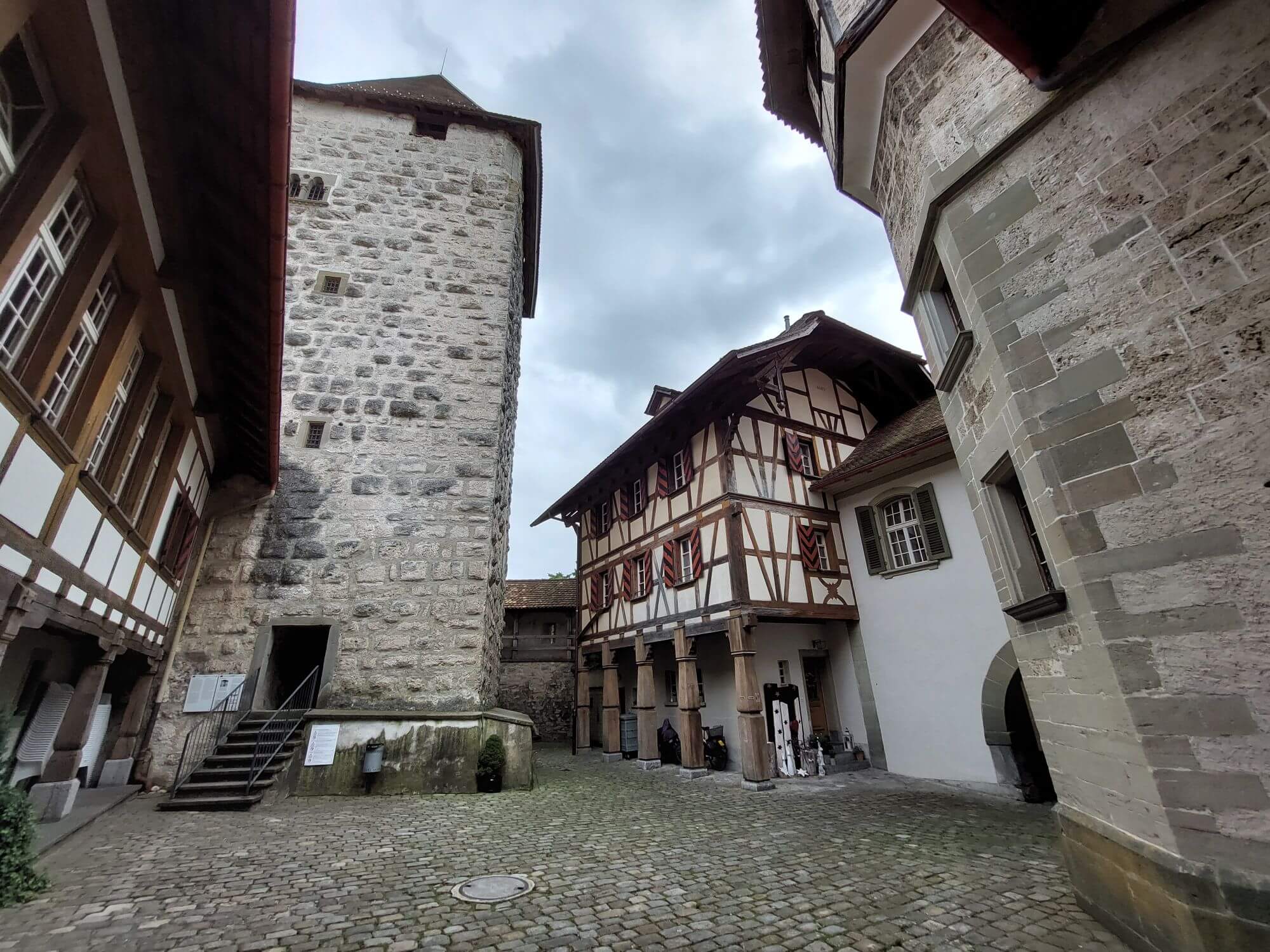 Zu meinem Erstaunen waren der Schlosshof und der Bergfried frei zugänglich. Fotos gab’s somit mehr als ich mir erhofft hatte. Das Schloss stammt aus dem 13. Jahrhundert und hat, wie die meisten, eine bewegte Geschichte mit mehreren Besitzerwechseln, Umbauten und Nutzungen hinter sich. Mittlerweile wird das Schloss als Eventschloss vermarktet.