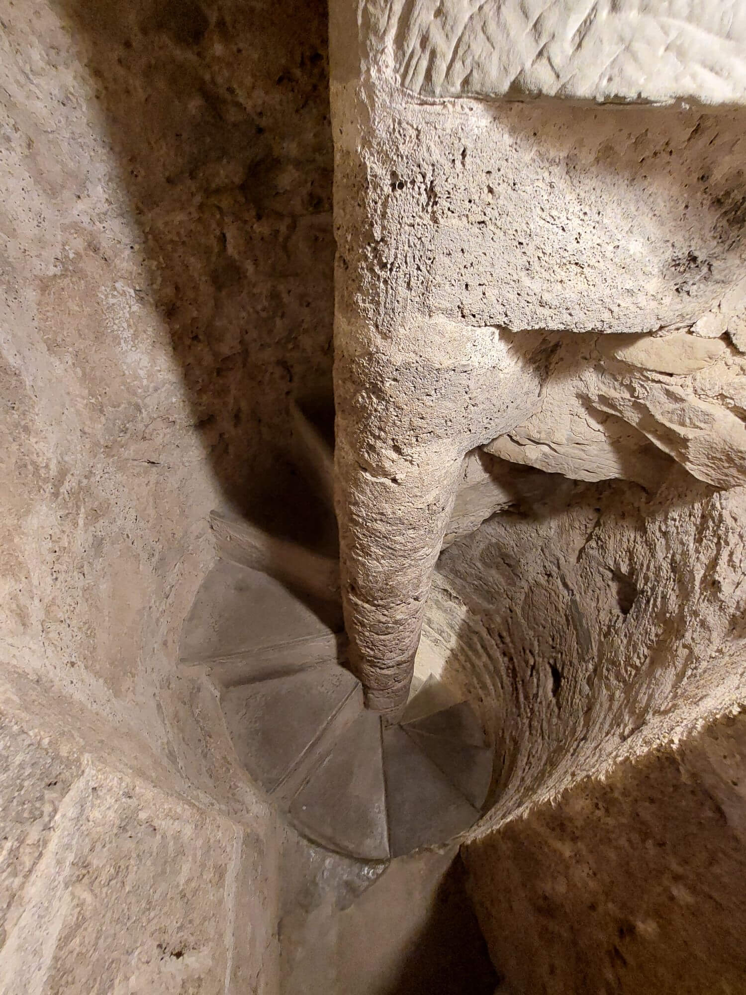 - Über diese sehr enge und steile Wendeltreppe wird schliesslich der Dachstock erreicht…