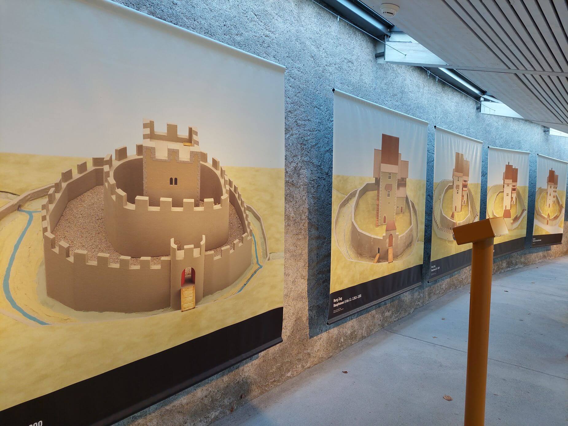 - Illustration von einigen der 26 Bauphasen. Bemerkenswert ist, dass der wunderschöne Fachwerkaufbau auf der ehemaligen Schildmauer einige hundert Jahre verputzt war.