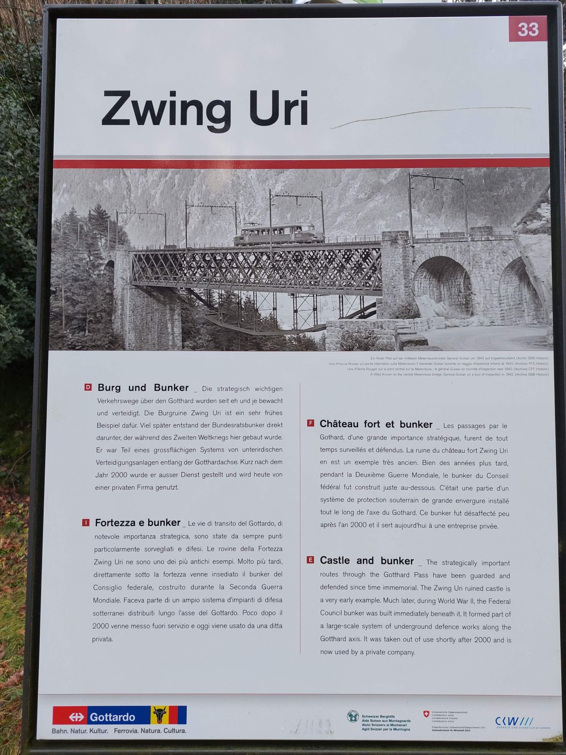 Zumindest so habe ich das beim Globi gelernt. Die Infotafel am Wegrand informiert da wesentlich nüchterner als mein Lieblingskasettli. Dafür ist noch zu erfahren, dass direkt unter uns der ehemalige Bundesratsbunker versteckt war…