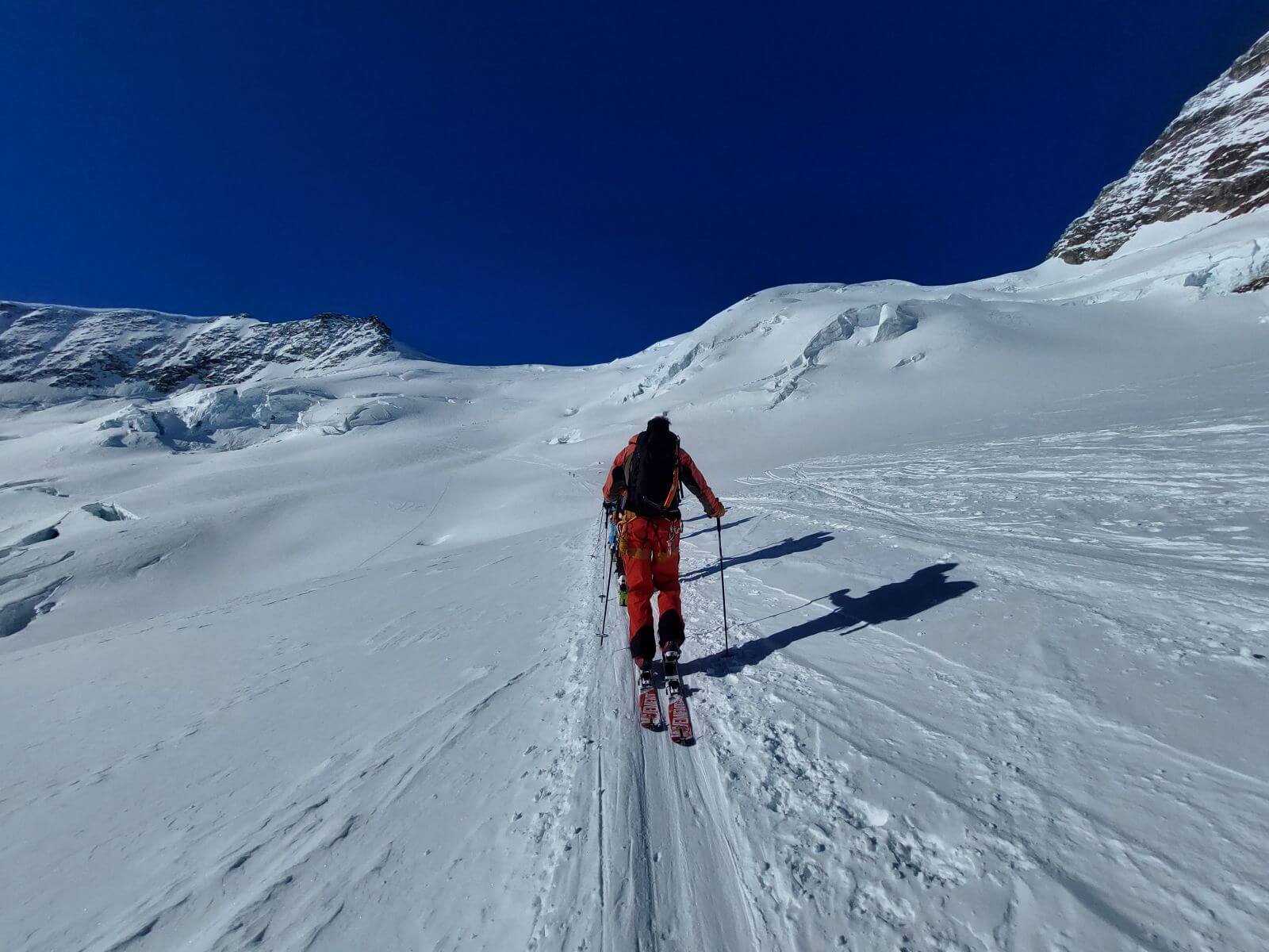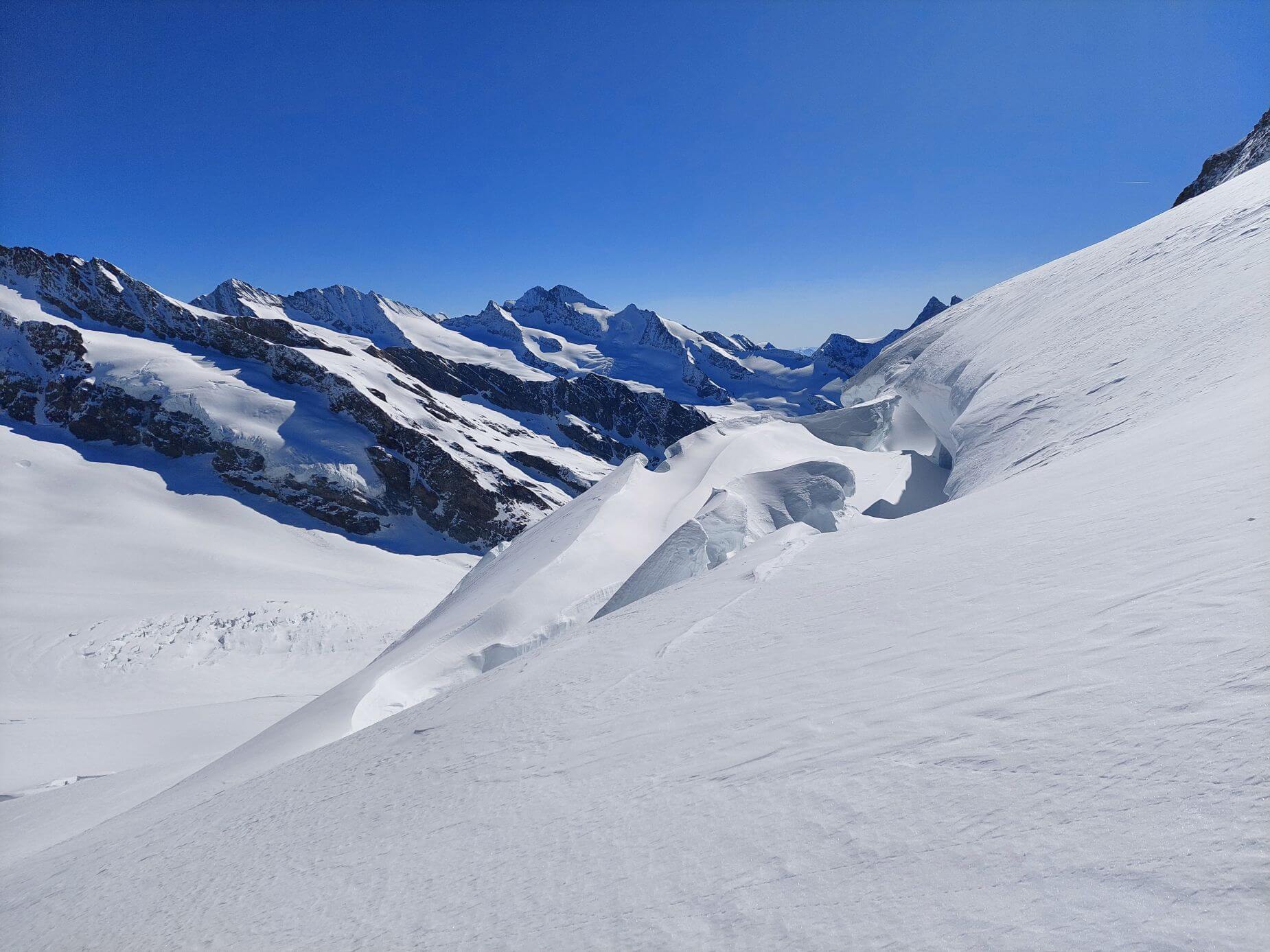 Den Mönch haben wir allerdings direkt hinter uns liegen gelassen. Diesmal führte unsere Route vom Stollenausgang am Jungfraujoch direkt zum Louwitor und weiter über Kranzbergfirn, Grosser Aletschfirn und Langgletscher ins Lötschental – viele Kilometer im Eis also, eine wunderbare Abkühlung!