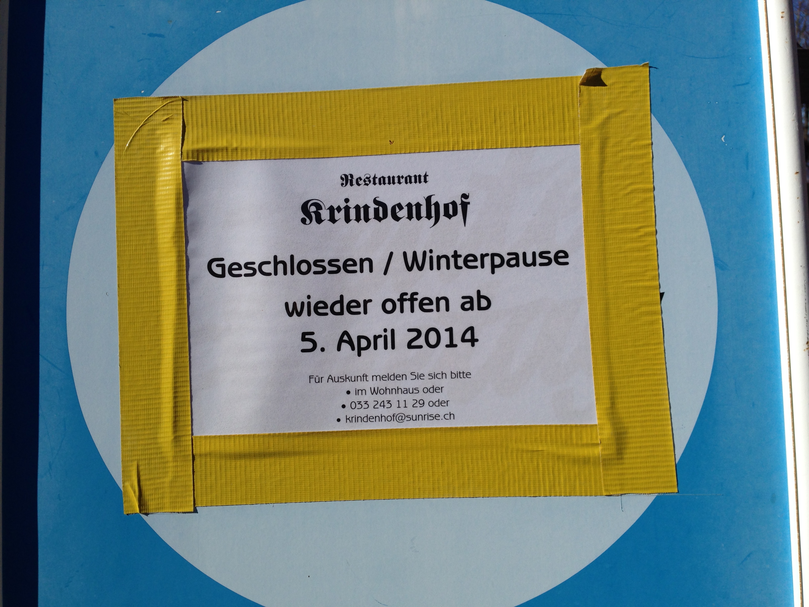 | @wotaber | Dies ist das Restaurant Krindenhof in Ringoldswil und die Gastgeber heissen Esther und Willi Keller-Gysel. Saisoneröffnung war am Samstag 5.April 2014. |