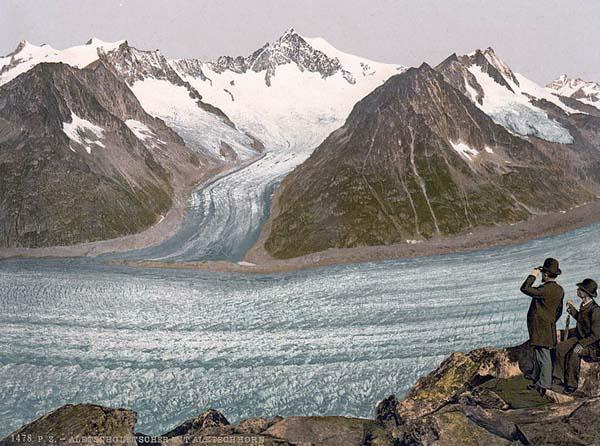 Das Aletschhorn ist der zweithöchste Berg der Berner Alpen und mit 4195 M.ü.M. der höchste Punkt der Gemeinde Naters. Obige Aufnahme zeigt den Blick vom Eggishorn via Aletschgletscher am Ende des vorletzten Jahrhunderts. (Quelle). Sollten Sie demnächst die Besteigung des Aletschhorns vorhaben: Die kürzeste Route führt via Mittelaletschbiwak und über den Nordost-Grat. Drei Tage sollten reichen.