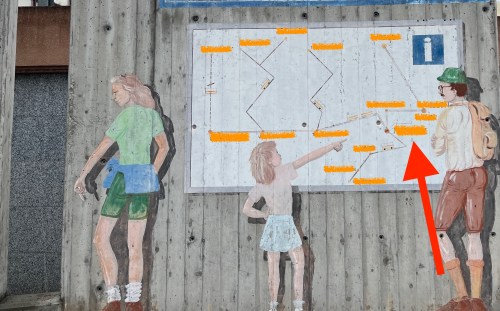 Das ist ein etwas aus der Zeit gefallener Streckenplan, aber wunderhübsch finde ich. Er beinhaltet Eisenbahnen, Postautos Luftseilbahnen. Er ist zu finden am Bahnhof, dort wo der rote Pfeil hinzeigt. Wo hängt dieses Meisterwerk?