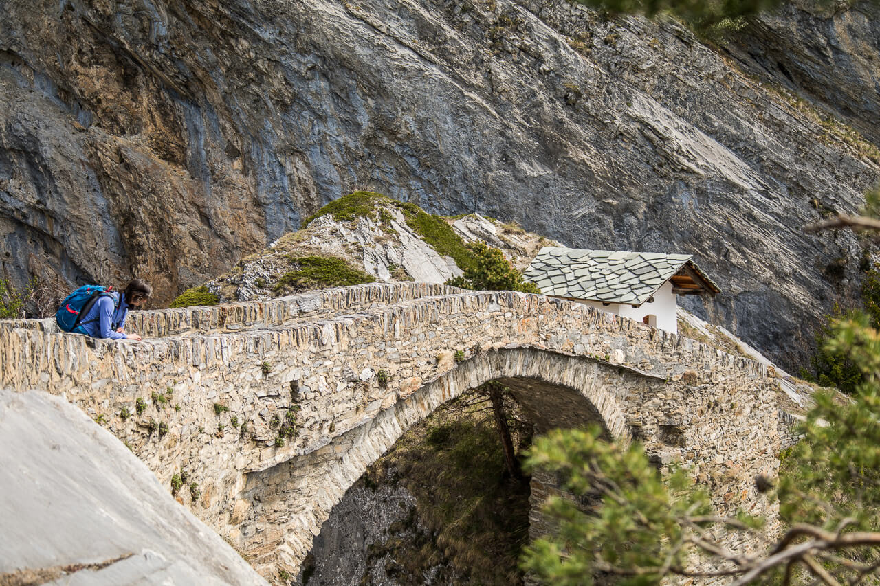 Die Brücke zwischen Leuk und Erschmatt überspannt den Feschelbach, der sich hier tief in den Felsen gefressen hat. Man ist nicht zwingend auf ein Auto angewiesen, man erreicht sie auch auf einer schönen Wanderung. Ornithologen freuen sich hier über die Felsenschwalben und den Mauerläufer.