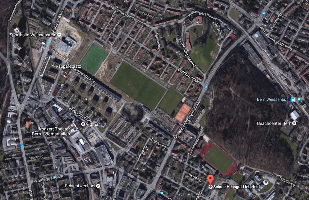 Marcel | Links aussen (Nordwesten): die Sporthalle Weissenstein, dann wird in der Mitte durch den FC Weissenstein getschuttet auf dem Sportplatz Weissenstein und rechts aussen (Südosten)spielt ist der Tennisclub Wander |