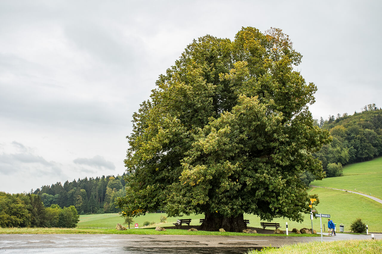 Ja, wer sich mit Bäumen auskennt, dem fiel das Räzel leichter. Es handelt sich hier um eine Linde, aber nicht irgendeine, sondern die berühmte Linner Linde im Aargauer Jura. Linn ist teil des Juraparkes Aargau.