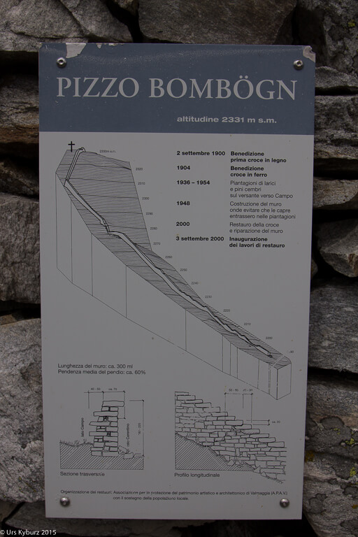Die Mauer führt von Süden her auf den Gipfel, wurde 1948 erbaut und sollte verhindern, dass die Ziegen die verletzliche Grasnarbe fressen, die die Erosion zur Felsplatte rechts davon verhindert. Schon bald verlor sie ihren Zweck und verfiel, wurde dann aber zu Beginn des neuen Jahrtausends wieder aufgebaut, zumindest die obersten 300 Meter. In einer ziemlich anspruchsvollen Wanderung kann der Gipfel von Bosco/Gurin aus erklommen werden.