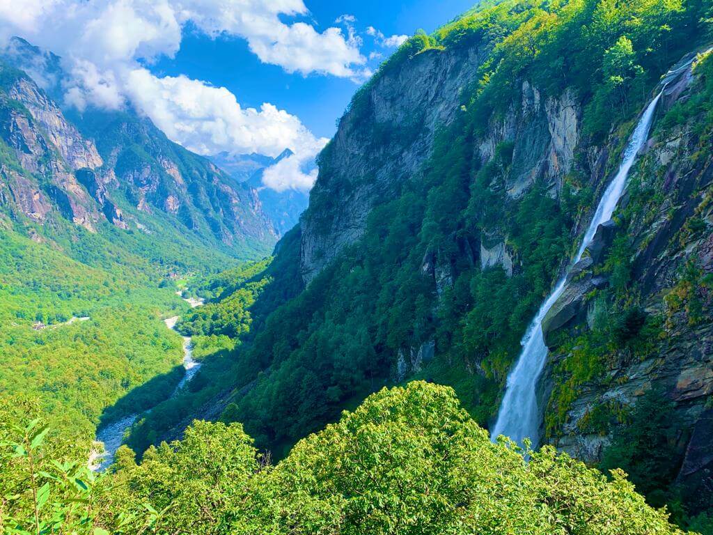 Nicht Jurassic-Park, sondern der Foroglio-Wasserfall und der Blick ins Bavonatal. Rechts oben beginnt das Calnegia-Tal: